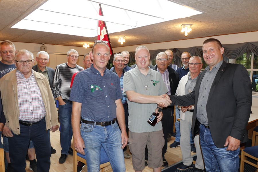 Formand Erik Staun og sidste års fuglekonge Martin Staun Hansen lykønsker Mogens Beltoft med den nye titel af fuglekonge. Foto: Nibe Avis